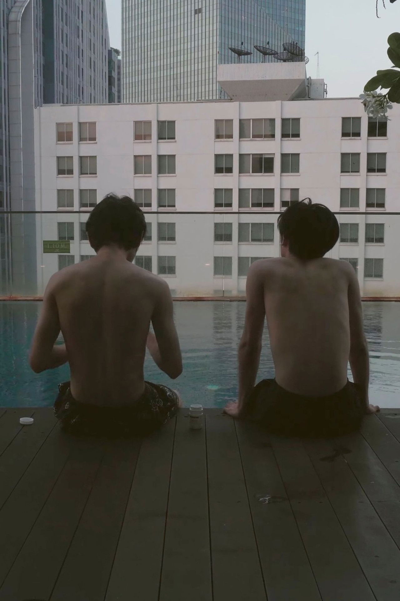 Two men sitting on the edge of a swimming pool, talking about their own pain.